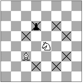 Knights are probably the most difficult piece for beginners to understand. They are worth three pawns as a general rule, about the same as the bishop. Their method of movement is that of an L-shape; they move two squares horizontally or vertically and then one more vertically or horizontally, respectively. They are the only piece that can "jump" over other pieces, due to their odd method of movement. In other words, they can always move onto one of eight squares surrounding them (assuming they are far enough away from the edge of the board to access a square). Their method of capture is the same as most pieces: moving onto the square in which the other piece occupies. A diagram showing how the knight hops around is shown below.
