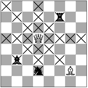 The queen is by far the most powerful piece. It is worth the equivalent of nine pawns, (two knights and a bishop) and has incredible mobility. The queen can move vertically, horizontally, or diagonally as far as it wants in any direction. They cannot, however, jump over pieces (knights are the only piece that can do this). Their method of capturing enemy pieces is to simply move onto the square that the enemy unit occupies. A diagram showing the queen's power is located below.